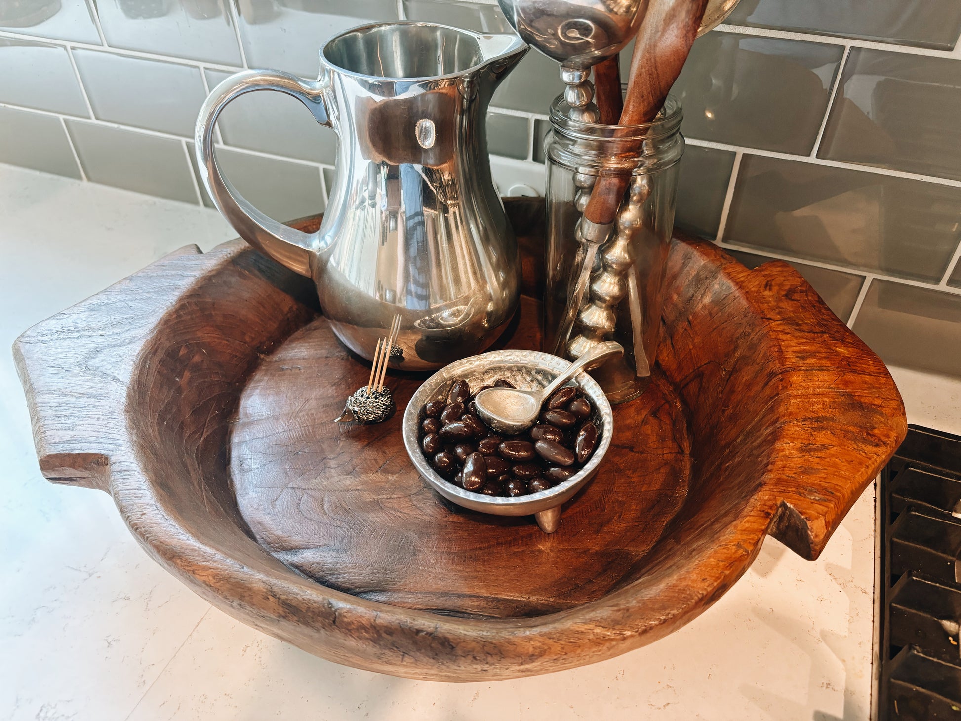 Hand-carved from solid wood, the wooden parat bowl brings a touch of warmth and nostalgia to your home. Originally used in traditional Indian kitchens, this versatile bowl is now a functional and stylish addition to any modern home. Display it on the countertop or use it as a centerpiece for your dining table, and let its earthy beauty and timeless appeal elevate your home aesthetic. This is part of the Fairmile Co collection.